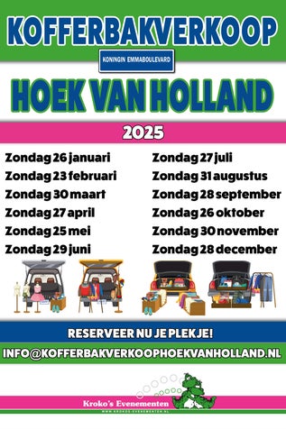 Ondernemersvereniging Hoek van Holland is verheugd om te kunnen mededelen dat we een samenwerking zijn aangegaan met Kroko’s Evenementen voor de uitvoering van de Hoekse Kofferbakverkoop aan de Koningin Emmaboulevard.